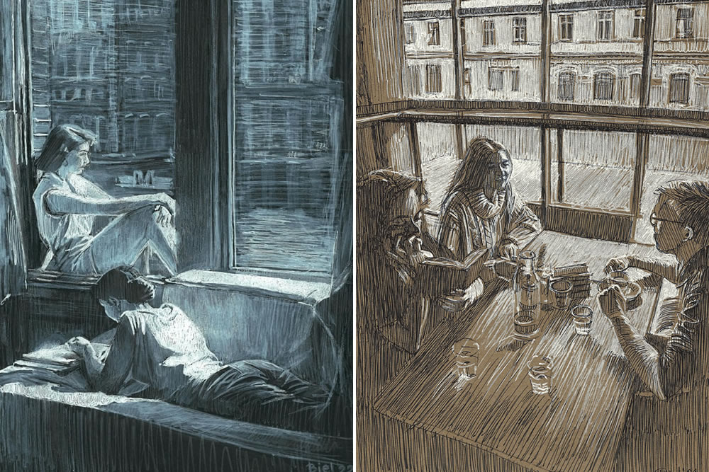 Polish artist Lukasz Biel creates incredible drawings with color and graphite pencils. The activities depicted here are everyday or regular occurrences that many of us engage in. They include going out for a drink with friends, engaging in a friendly game of chess, immersing ourselves in a book to alleviate the boredom of daily commutes, dancing with a partner, and, of course, scenes of people reading books. These activities are relatable to people from all walks of life.