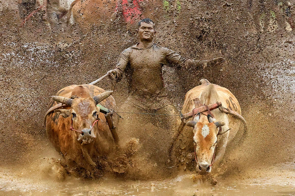 "This photograph captures a powerful moment from the traditional Pacu Jawi festival, held in West Sumatra, Indonesia. This centuries-old event, also known as the “mud bull race,” is a celebration marking the end of the rice harvest season. Competitors ride wooden plows between two bulls, racing through muddy fields to demonstrate their strength, balance, and skill."
