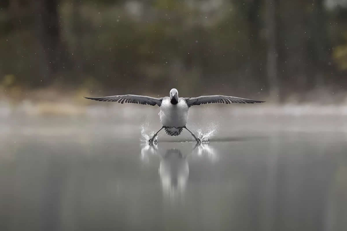 "This photograph came about as a hard-won victory of patience. I have been photographing Red-throated Loons for several years. I lie on the edge of a bond under a camouflage net and photograph their spring courtship displays from my hide. The ground is wet and cold. That morning, an unseasonable early-spring snowfall caught me by surprise, making photography almost impossible."
