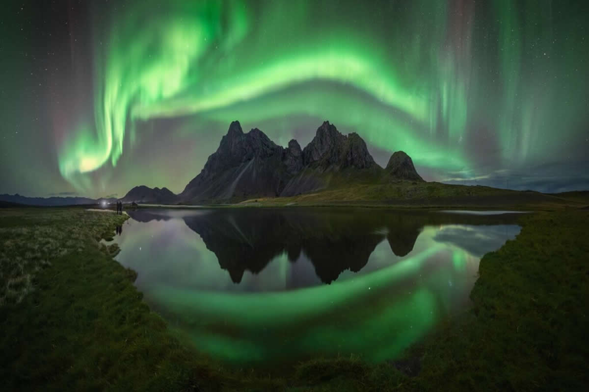 Auroras were already visible in the sky during the blue hour, so I quickly headed to the spot where I had planned the composition. The wind shifted, making it difficult to capture the reflections, but the moment the sky exploded, the wind stopped, and for a few brief moments, I achieved my dream photograph. It was a great joy to witness and capture such a moment."