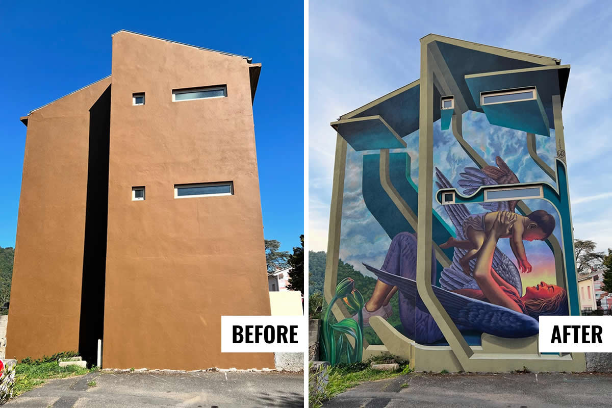 Each brushstroke aligns perfectly with the building’s natural shape, making the artwork feel like it’s part of the structure itself. This technique, known as anamorphosis, tricks the human eye into seeing depth where there’s none. It’s street art at its smartest — interactive, powerful, and absolutely unforgettable.