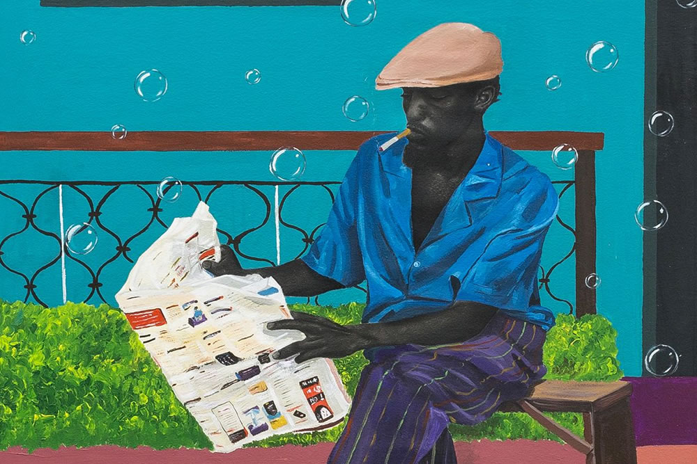 In his words “My art is an expression of figurative images using charcoal and colors to give it a contemporary look. It talks about situations in African society. The skin is an essential thing. I love to create it by focusing on such details as contrast. The dark hue of the skin is usually accompanied with vibrant colors for that complementary yinyang color contrast. I then sum up the work with bubbles – this captures the temporariness of the pressures we face. (…) My theme and messages focus on the situations in Africa – corruption, self-esteem, negligence, greed, e.t.c, also the inferiority complex suffered by Africans. My aim is to use my art to rid the society of these ills. I believe in the potentials of the African continent and I believe we can achieve greatness if we unite.”