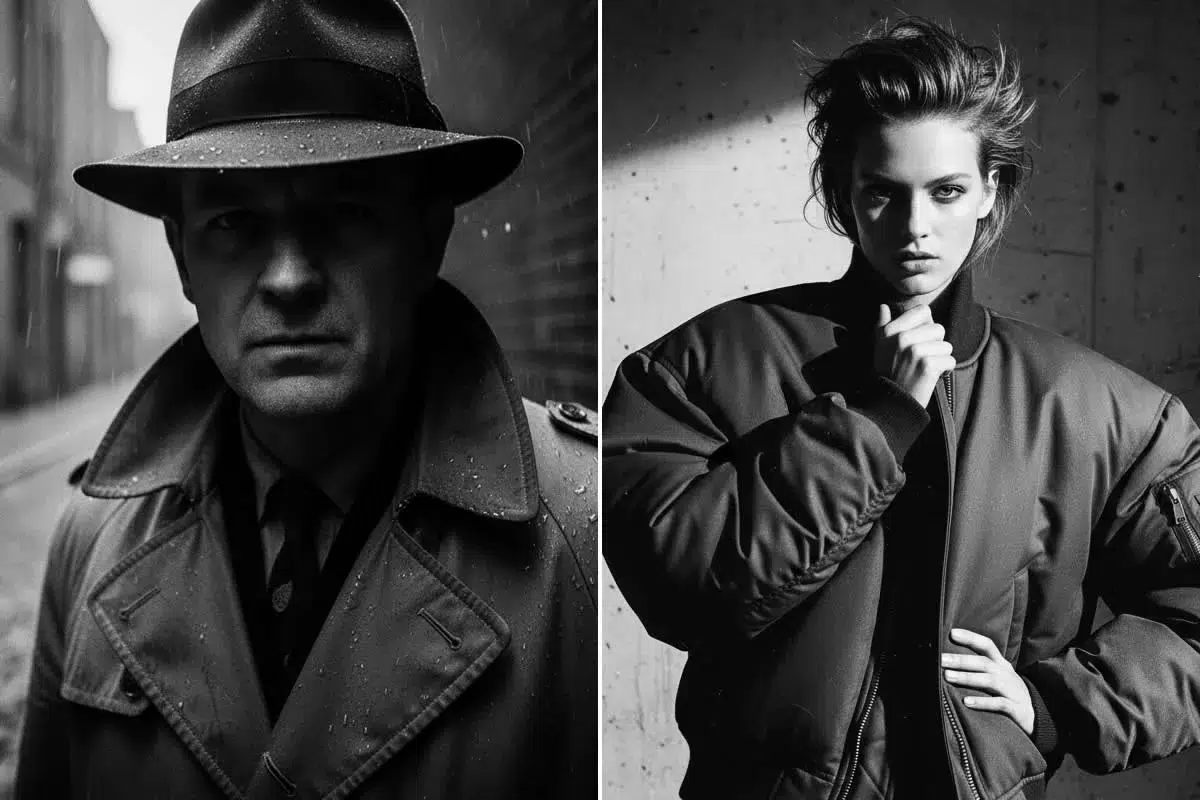 Prompt: High-contrast black and white portrait of [a detective in a trench coat], cinematic style, deeply shadowed eyes, chiaroscuro lighting, strong single light source from the left, heavy film grain texture, analog photo, moody and dramatic, 35mm lens, 8K, ultra-detailed.
