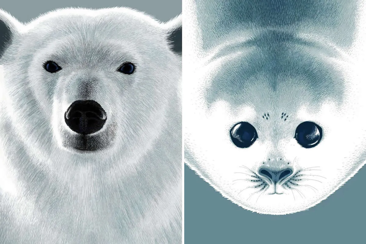 What makes her approach special is restraint. She doesn’t over-decorate or crowd the page. White space becomes part of the story, letting the viewer breathe and linger. Fur, feathers, and skin are hand-drawn with obsessive care, often in deep blacks and cool blues that hint at dusk, snow, or deep water. The result is work that feels timeless—like illustrations pulled from a nature journal kept by a traveler who really paid attention.
