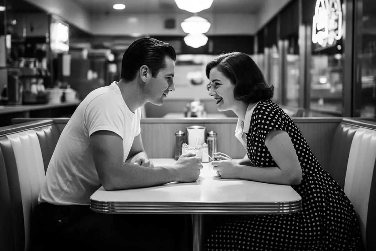 AI Prompt: A hyper-realistic, high-contrast black and white photograph of a couple sitting in a vinyl booth at a brightly lit American diner. The man is wearing a crisp white T-shirt and the woman has a polka-dot dress. Dramatic shadows and highlights, deep blacks, no digital noise, simulating a medium format camera with a flash, reminiscent of classic Life Magazine photojournalism.