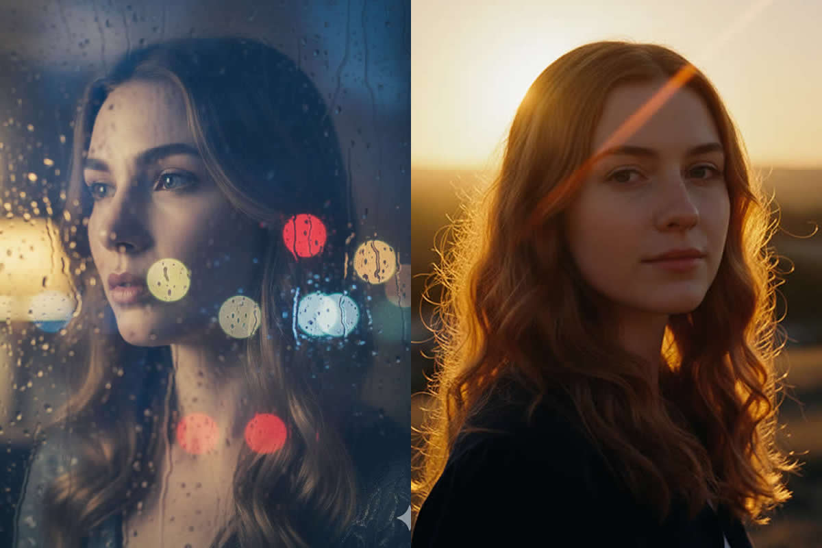 Prompt: "A contemplative portrait shot through a rain-streaked window. Subject is illuminated by warm, soft indoor light. Blurred city lights outside creating colorful bokeh. Moody, reflective atmosphere, with a cool blue film filter applied."