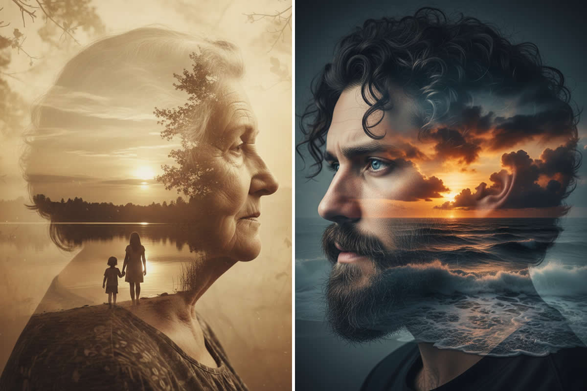 Prompt: "Double exposure artistic portrait of an elderly woman in profile, blended seamlessly with a serene nature landscape. Inside her silhouette, depict a nostalgic scene of a woman and a child walking hand in hand along a peaceful lakeside during sunset. The sky is filled with soft golden clouds, trees, and reflections on the calm water. The overall tone is emotional, warm, and cinematic — symbolizing memory, legacy, and generational connection. Use soft lighting, natural warm tones, and fine detail to create a touching, dreamlike composition."