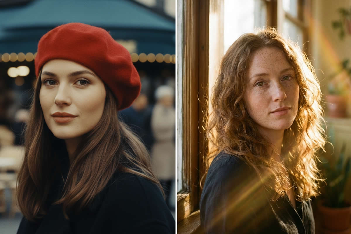 Prompt: “A beautiful face with a red beret, cinematic street photography style. Soft afternoon light, muted film colors, 8K, professionally graded, shallow depth of field, creamy bokeh, looking like a high-end fashion editorial.”