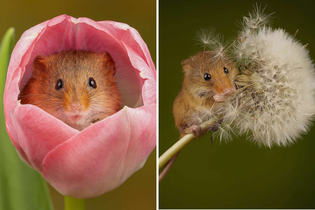 What makes these photos even more magical is the setup behind them. All these harvest mice were photographed in a purpose-built indoor studio, designed specifically for photographers who want high-impact, high-quality images without depending on unpredictable weather. And trust me—this controlled environment is how Herbert gets those perfect shots of mice balancing on tulip stems, mice peeking through flowers, and mice striking accidental model poses with the most adorable expressions.