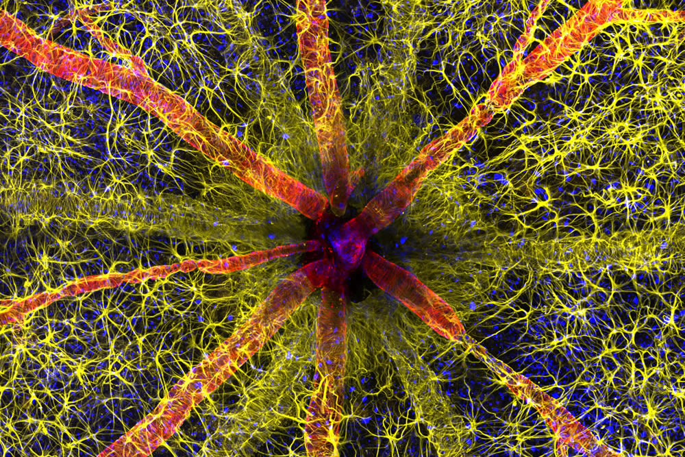 #1. Rodent optic nerve head showing astrocytes (yellow), contractile proteins (red) and retinal vasculature (green) by Hassanain Qambari & Jayden Dickson