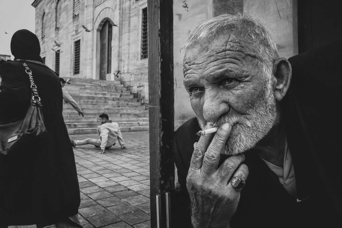 His photos hit different because he doesn’t force moments. He lets them unfold. A old man smoking, people playing cards, kids playing with pigeons, an old man lost in thought—Ovidiu catches these slices of life exactly as they are. Add Istanbul’s iconic cats, flapping birds, textured walls, chaotic lanes, and that insane architectural geometry, and you’ve got a recipe for some seriously powerful frames.