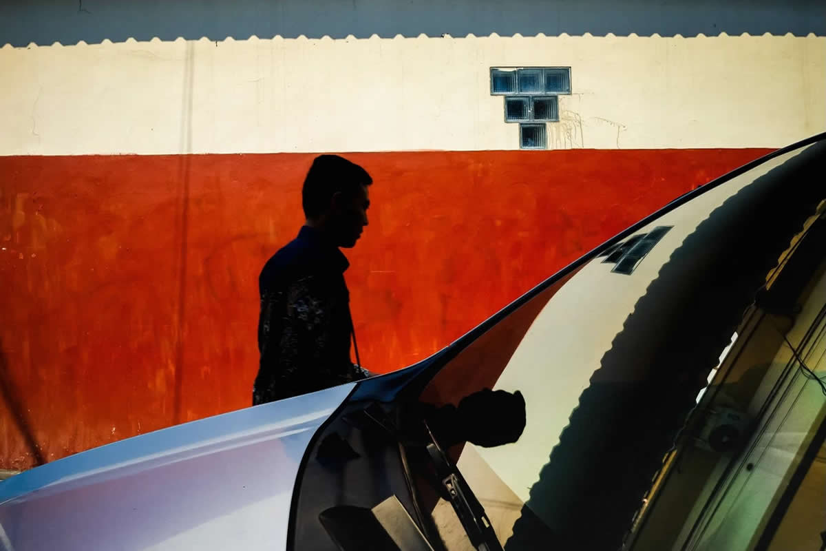 Silhouette of a man walking past a red and white wall with a car in the foreground reflecting his figure, creating strong contrast and clean geometric composition in street photography.