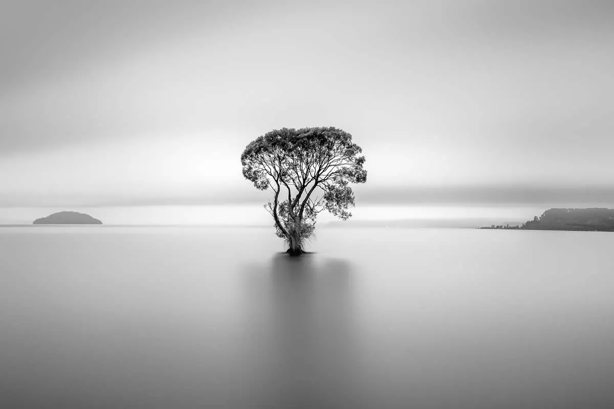 Lone tree standing in still water, B&W minimalist landscape