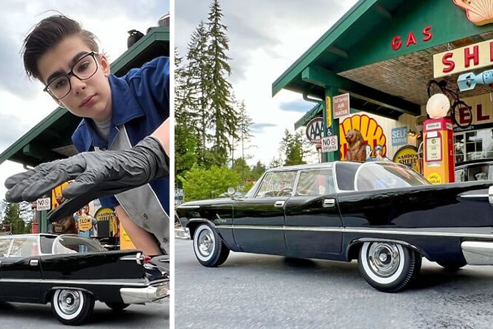 A young, dark-haired artist, clad in a leather jacket, stands confidently before a table designed to resemble pavement slabs. Resting on the table are meticulously crafted models of classic cars—ranging from pristine, gleaming specimens with fresh paint and chrome surfaces to weathered, rusty, and worn vehicles. In his hands, the teenager cradles an iPhone, the tool he wields to bring his extraordinary visions to life.