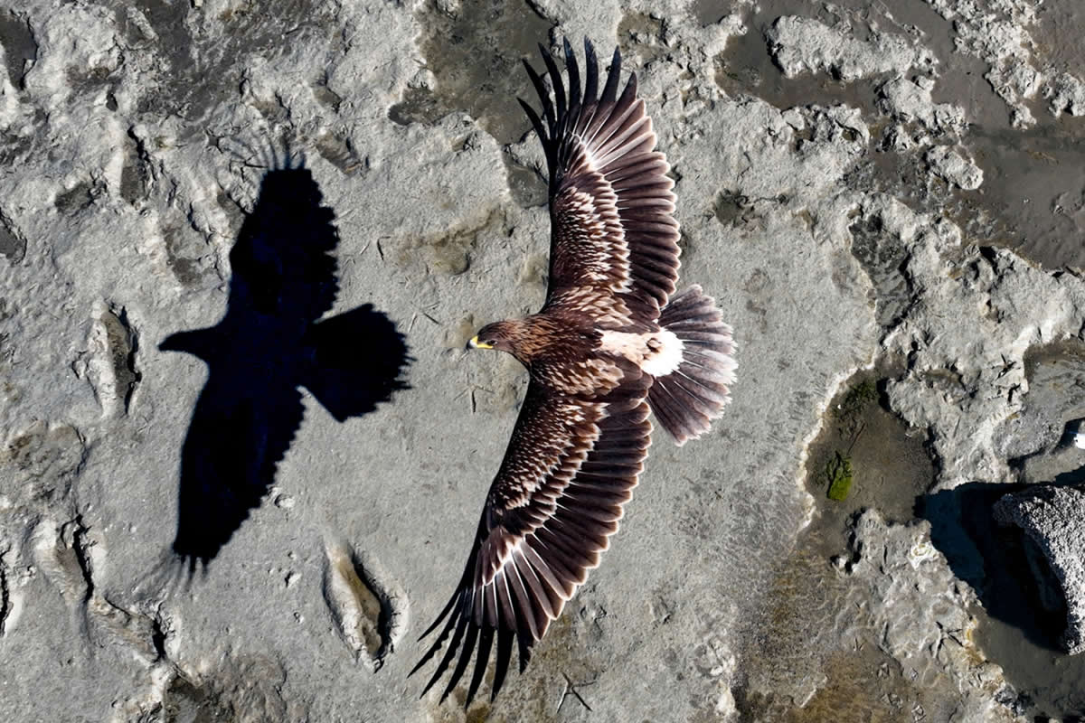 "This is not merely an image of natural beauty; it is a visual statement. The eagle’s shadow does not simply fall on the ground—it marks it, confronts it. A silent environmental message emerges: no matter how high life flies, it remains tethered to the earth beneath."