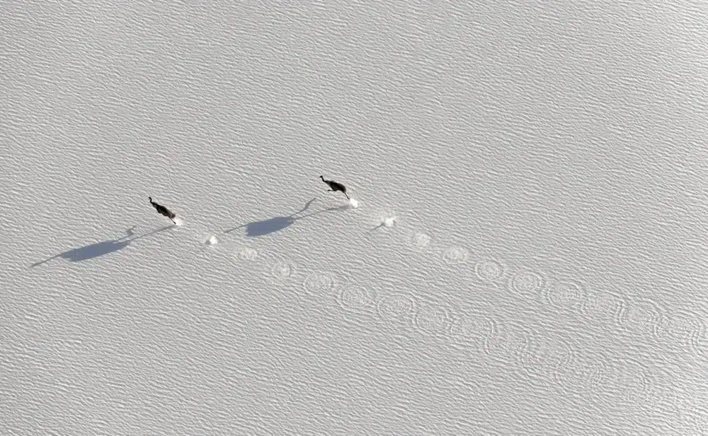 Aerial view of two birds walking across snow, leaving tracks