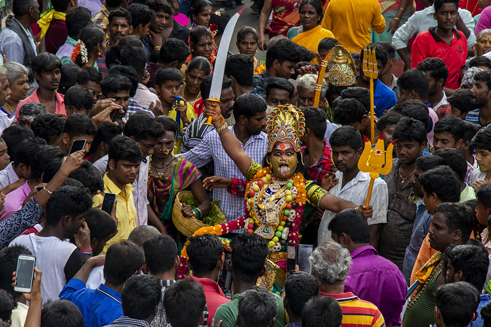 Sivaratri celebrates the convergence of Siva and Shakti. The “Mayana soora Thiruvizha” is a festival dedicated to Angalamman (a fierce guardian deity worshipped widely in Southern India) and is celebrating the small village of Kaveripattinam, the day after Mahasivarathri (the great night of Lord Shiva). Kaveripattinam is a panchayat town in Krishnagiri districts in the Indian state of Tamil Nadu. On this day tens of devotes can be seen at the temple. The festivals stand out because of “Kaliakam”. the personification of goddess Kali. This transformation of kids, men and women are done by painting their faces and adorning attire like Goddess Kali. Once they are ready, they hide their faces until they reach the temple and worship the goddess. There are others who express their devotion by having various parts of them pierced by a metal spear, knife or hooks that are used to dangle them. They parade around the village till evening.