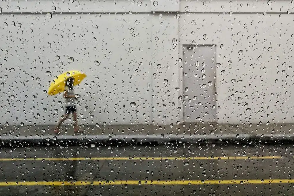 Famous street photographers capturing a person with yellow umbrella through a rain-covered window